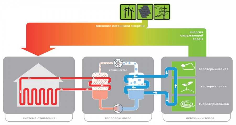 Циркулирующий по нему фреон нагревается под воздействием окружающей среды, в контуре насоса под большим давлением переходит в газообразное состояние, в результате чего температура поднимается до 70 С°. Внутренний разносит нагретый в насосе теплоноситель по дому.
