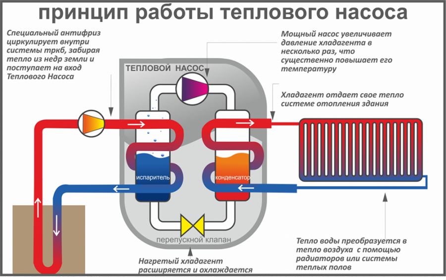 Принцип действия основывается на способности таких веществ, как фреон, закипать при низких температурах. Когда оно переходит в газообразное состояние, выделяется тепловая энергия. Установка состоит из внешнего и внутреннего контуров, а также контура насоса. Внешний закапывается под землю или опускается на дно водоёма.