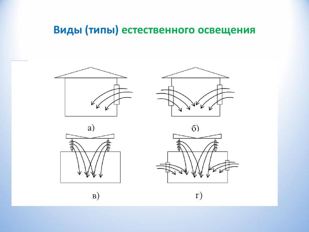 Условно эти приёмы можно разделить на три вида естественного освещения: боковое (а,б), верхнее (в) и комбинированное (г).
