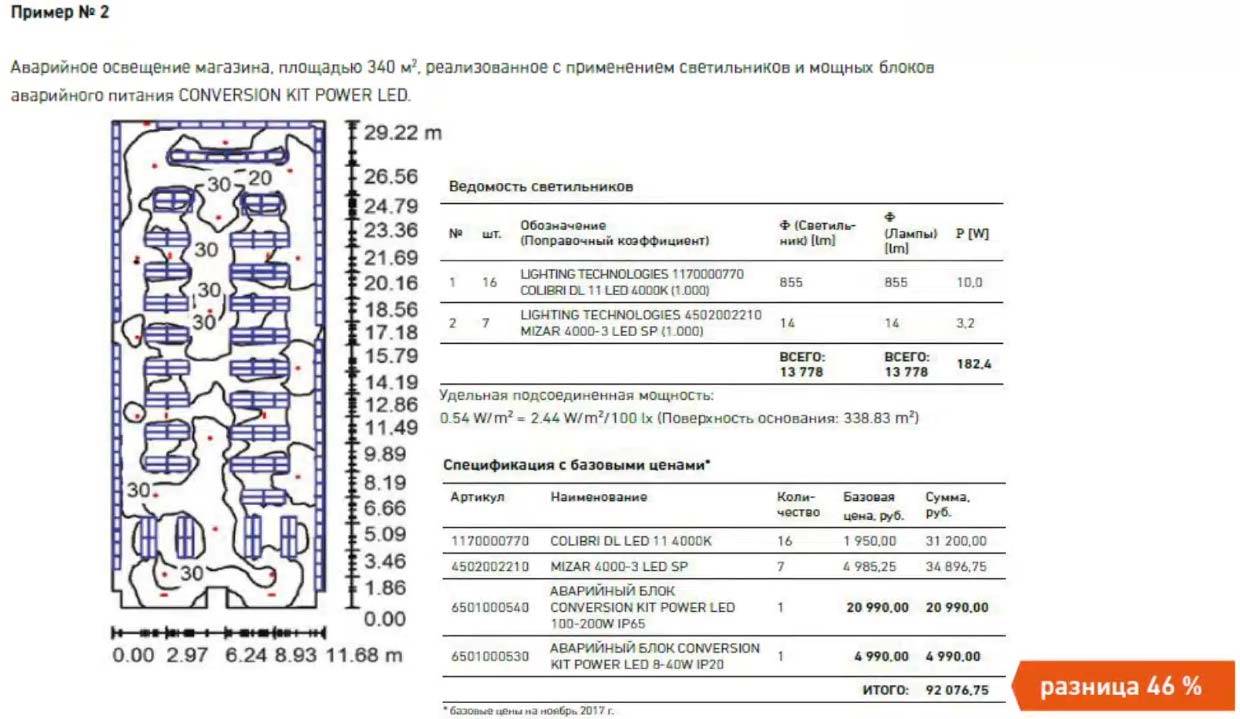Как вариант, можно изначально выбрать тип светильников, оборудованных БАПами. Таким образом, в случае аварии будет включаться лишь один модуль, выдавая не 100, а 10-15% освещения. В этом случае большое значение имеет местоположение светильников и равноудаленность их друг от друга.