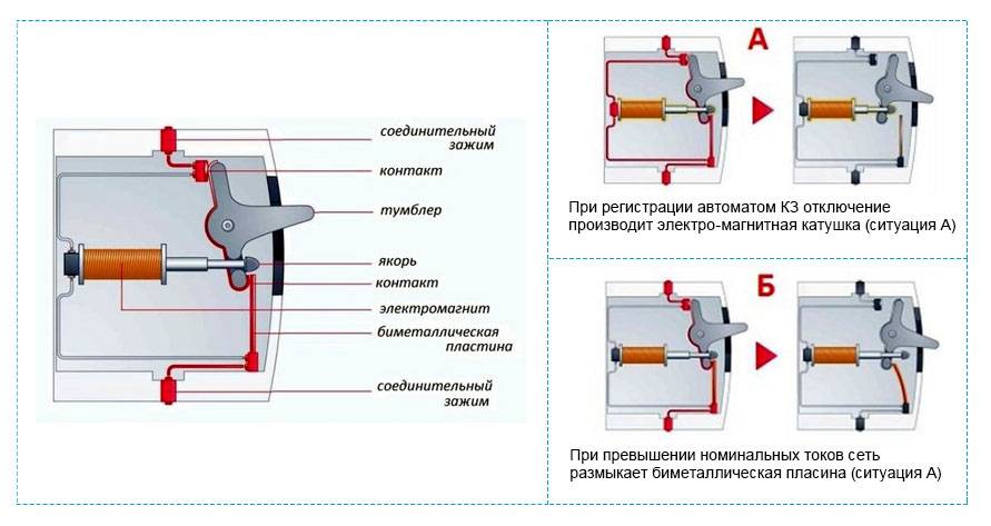 При коротком замыкании (т.е. при мгновенном возрастании тока в несколько раз) электромагнитный расцепитель отключает электрическую цепь за доли секунды.