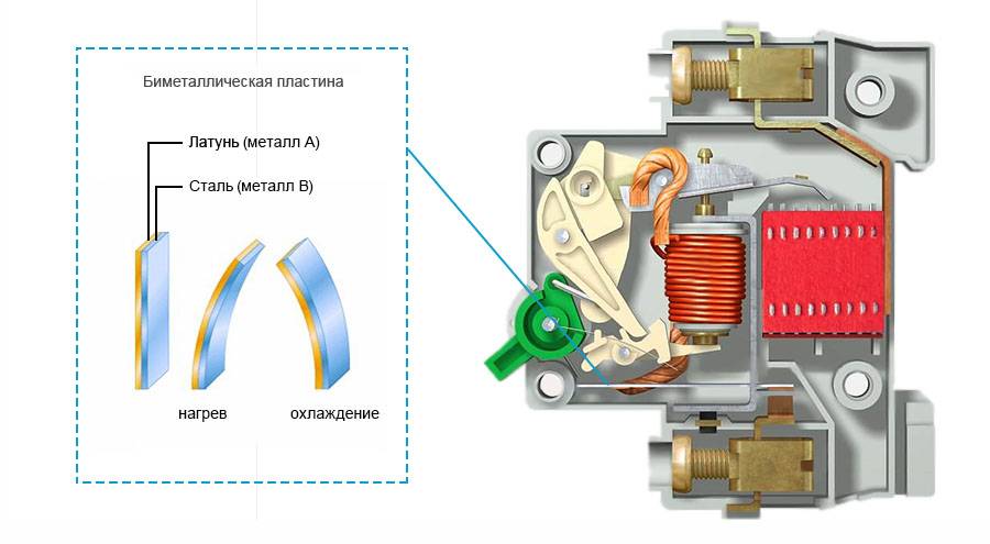 Тепловой расцепитель обеспечивает защиту электрической цепи от токов перегрузки. Перегрузка может возникнуть при включении в сеть электрооборудования общей мощностью превышающей допустимую нагрузку данной сети, что в свою очередь может привести к перегреву проводов разрушению изоляции электропроводки и выходу ее из строя.