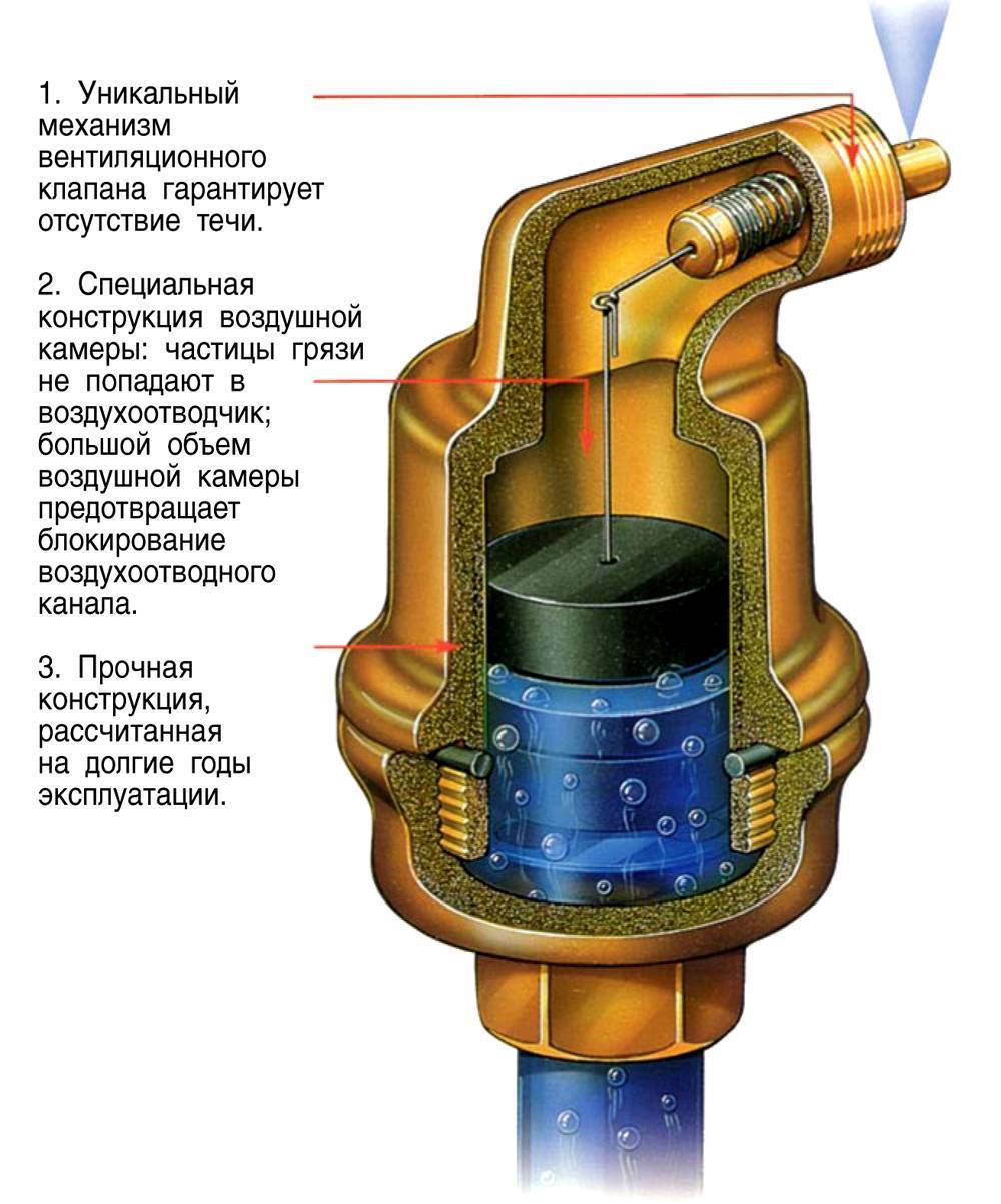 Поплавковые развоздушиватели служат для удаления воздушных пробок, а также помогают ускорить слив теплоносителя из системы на время профилактических или ремонтных работ. Из-за понижения уровня теплоносителя в контуре клапаны автоматически открываются, и поступающий через них воздух заставляет жидкость быстрее сливаться.