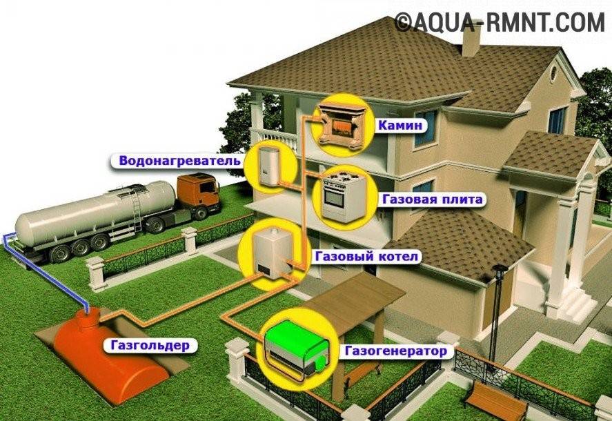 Газовая смесь сберегается в газгольдере в сжиженном виде. В наружные трубы смесь подается в газообразном состоянии, так как легко испаряется при снижении давления в редукторе. По внутренним трубам газ подается к кухонной плите, бойлеру, котлу. Топливо можно использовать и для получения электроэнергии, если поставить газовый генератор.