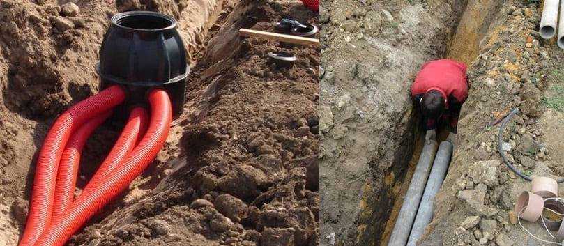 - земляные работы. Они выполняются исходя из типа сети, размеров и специфики укладки кабеля. Кроме того, необходимо учитывать расстояния, гидрогеологические условия участка, наличие других систем и возможность расширения сети во время последующей эксплуатации. Сначала выкапывают котлован под колодец, после чего роют траншеи;