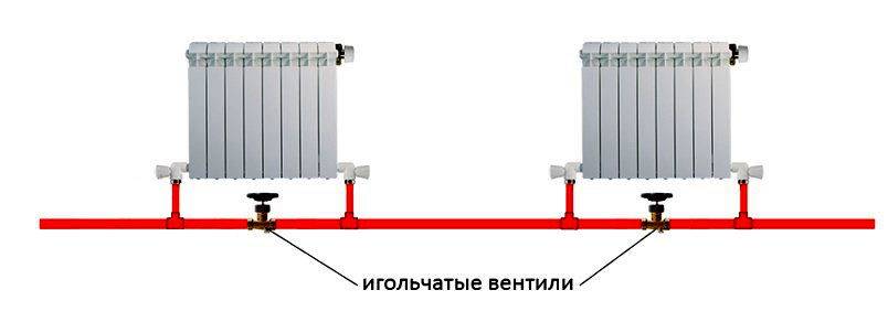 - проходя по линии трубы от дальнего радиатора к ближнему, вентиль каждого заворачивают на пропорциональное их числу количество оборотов.