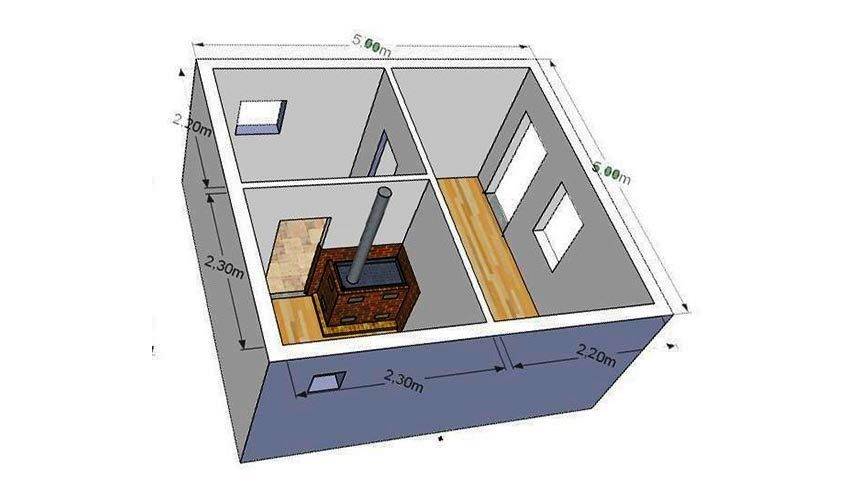 При составлении проекта нужно учесть будущее расположение бани, оценить уровень грунтовых вод и финансовые возможности, на основе этих показателей подбирать или составлять чертеж. Размер парной зависит от того, сколько человек планирует ее посещать.