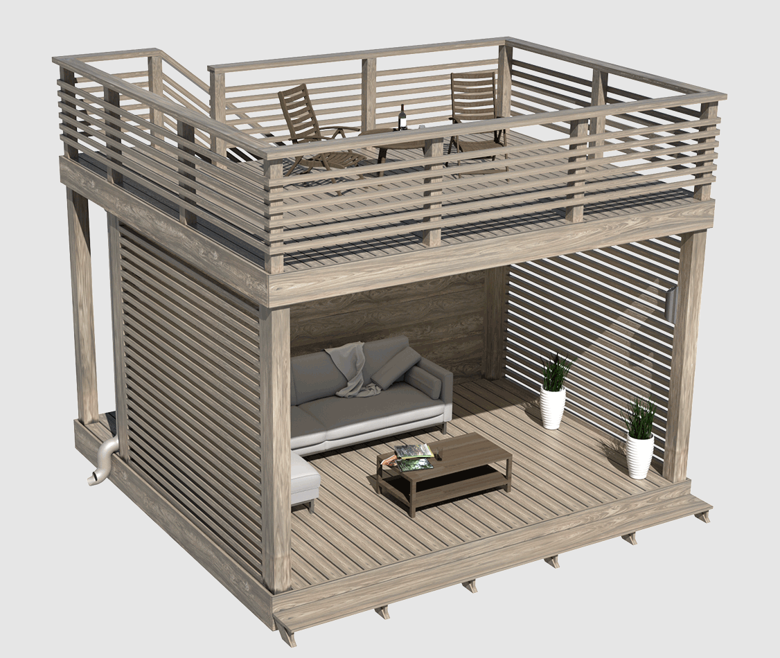 - Шаг 1-7. Выкладываем пол, оставляя щели по 6 мм. Обрабатываем древесину и террасную доску воском цвета палисандра.