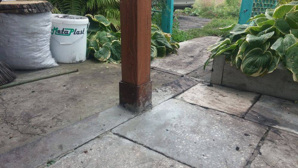 Чтобы вертикально установить брус, было принято решение использовать металлические «гильзы», сделанные из профильной трубы. Под трубу копались небольшие ямки, которые заливались бетоном. После застывания бетона оставалось только поставить внутрь «гильз» брус.