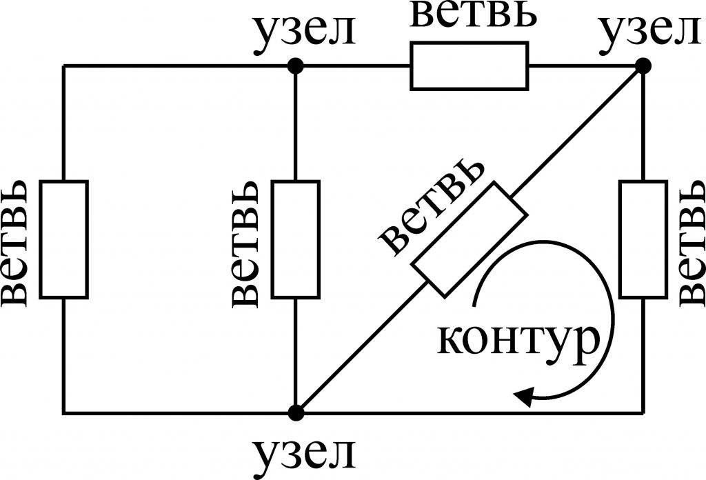 - Контур – последовательность ветвей, которая образует замкнутый путь. При этом один из узлов является как началом, так и концом пути, а другие узлы встречаются в контуре только один раз.