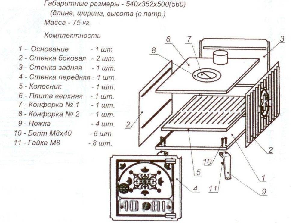 Конструкция печи достаточно проста, состоит из основания, двух боковых стенок, задней и передней стенки, колосника, верхней плиты. У модели имеется две конфорки, расположенные на верхней плите. Данная конструкция располагается на 4 коротких ножках. Для соединения частей печки используются гайки М8 и болты М8×40.