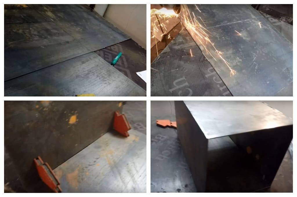 - Одну часть привариваем. В другой части вырезаем часть под дверцу, размер дверцы можно выбрать любой. На вырезанном кусочке довариваем боковые бортики. На корпусе привариваем полосы по периметру.