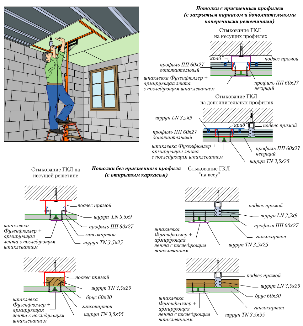 Монтаж гипсокартона к потолку предполагает соблюдение следующих правил.