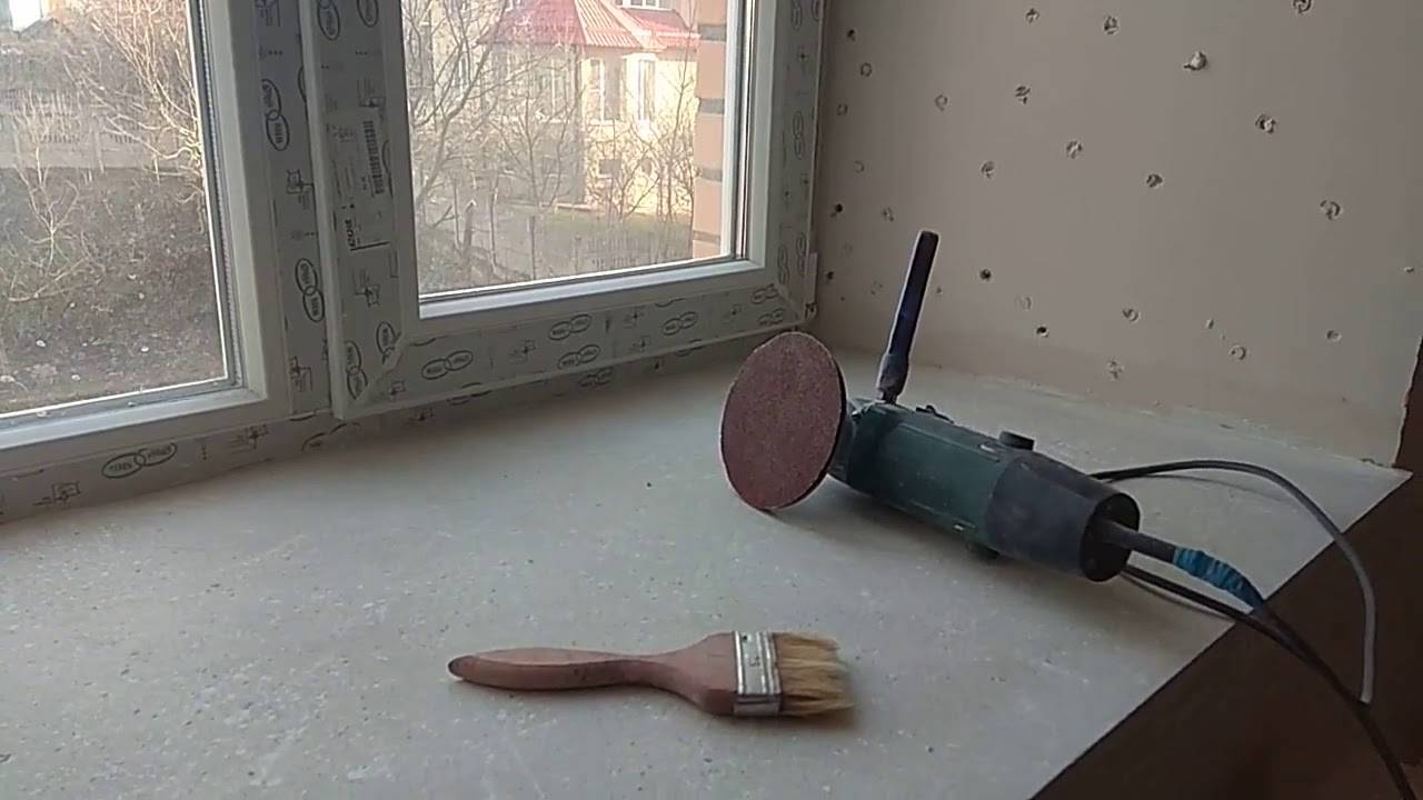 - Повторно отшлифуйте поверхность подоконника, очистите его от образовавшейся пыли.