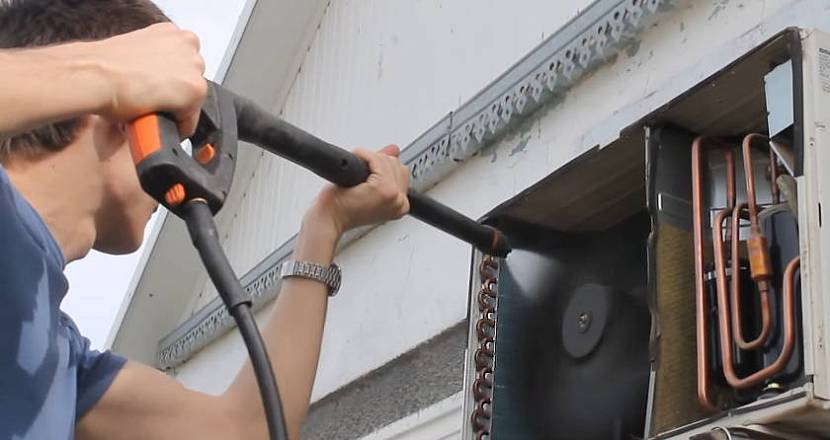 - Чистка теплообменников, как внешнего, так и внутреннего блока. Причем теплообменник, расположенный во внутреннем блоке обрабатывается генератором пара с использованием различных неагрессивных средств и аэрозолей. А чистка теплообменника, который находится во внешнем блоке, происходит под высоким давлением;