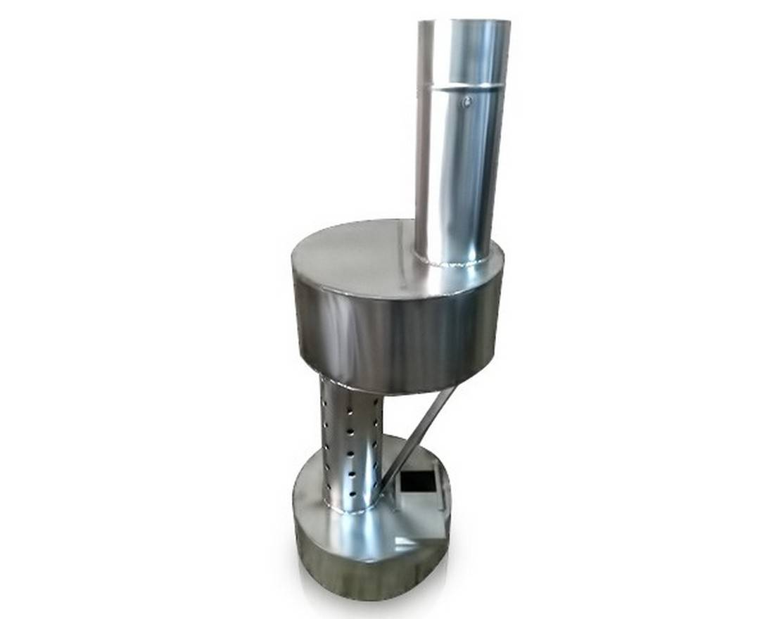 13. На такой печи можно приготовить пищу или согреть воду. Для этого в верхней части короба прорезается отверстие необходимого диаметра. Конфорку для печи, которая будет вставляться в это отверстие, можно приобрести в любом строительном магазине.14. Для удобства пользования конструкция устанавливается на ножки или сварную подставку из труб.15. Дымоходная труба присоединяется к печи с помощью гильзы. 16. Для вставки заслонки-шибера, регулирующего выход дыма, в трубе просверливаются два отверстия. Прут металла вставляется в отверстия и сгибается под 90°. К нему в центре трубы прихватывается «пятак» из металла – шибер, диаметр которого должен быть чуть меньше диаметра самой трубы на 3-4 мм.