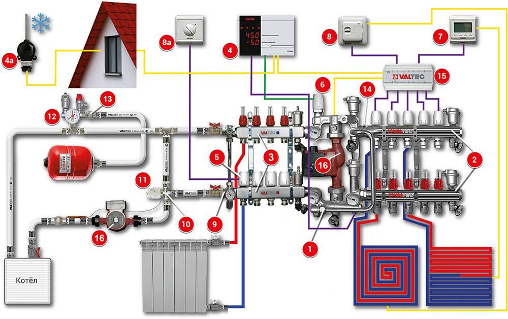 Вашему вниманию предлагается пример современной энергоэффективной системы отопления на базе оборудования VALTEC. Она разработана для загородного дома или любого другого объекта с автономным источником тепла (котлом и т.д.). Схема предусматривает комбинированное использование традиционных радиаторов и напольного отопления. Такое сочетание технологий, а также примененная автоматика дают возможность обеспечить высокий уровень комфорта при оптимальных затратах на приобретение оборудования и его эксплуатацию. В схеме использованы и отображены комплектующие из актуального ассортимента VALTEC.
