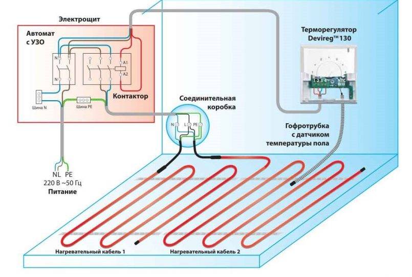 - при наличии термостата, управляющим единичным контуром теплого пола, монтаж осуществляется соответствующими проводами;
