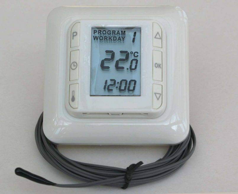 Разные модели термостатов могут регулировать температуру пола или воздуха. Зависит это от типа датчика, который совместим с устройством. Выбор типа датчика зависит от того, какую функцию выполняет подогрев. Если система дополнительная и ее задача — повышение комфорта, используют датчик температуры пола. Ведь за обогрев воздуха в этом случае отвечает другая система, а задача водяного или электрического подогрева — создать и удерживать комфортную температуру только под ногами. Этот датчик для терморегулятора пола является выносным. Подключается к специальным клеммам на корпусе. Сам контролирующий элемент находится на конце электрического кабеля, при укладке располагается посредине между витками греющего элемента на полу на расстоянии не менее 50см от стены.