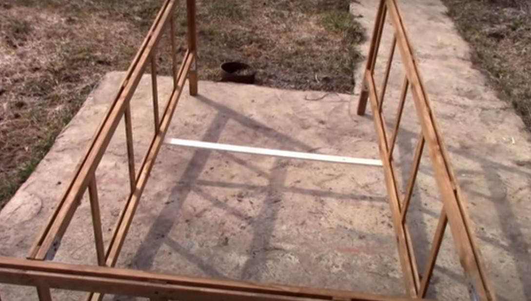 7 По завершении работы с опорами производится сборка горизонтальных перекладин. В них подготавливаются углубления, по размеру равным опорным столбам. После сборки столбов с углублениями, горизонтальные перекладины должны выпирать на 10 мм для создания выступа