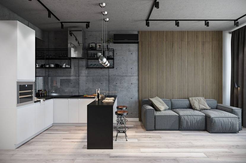 - Натуральный бетон. Неизменной популярностью пользуются стеновые бетонные плиты натуральных и близких к ним оттенков: серых, черных, белых, слоновой кости. Такие материалы бывают гладкие, шероховатые и узорчатые; их с успехом применяют для оформления стильных интерьеров.