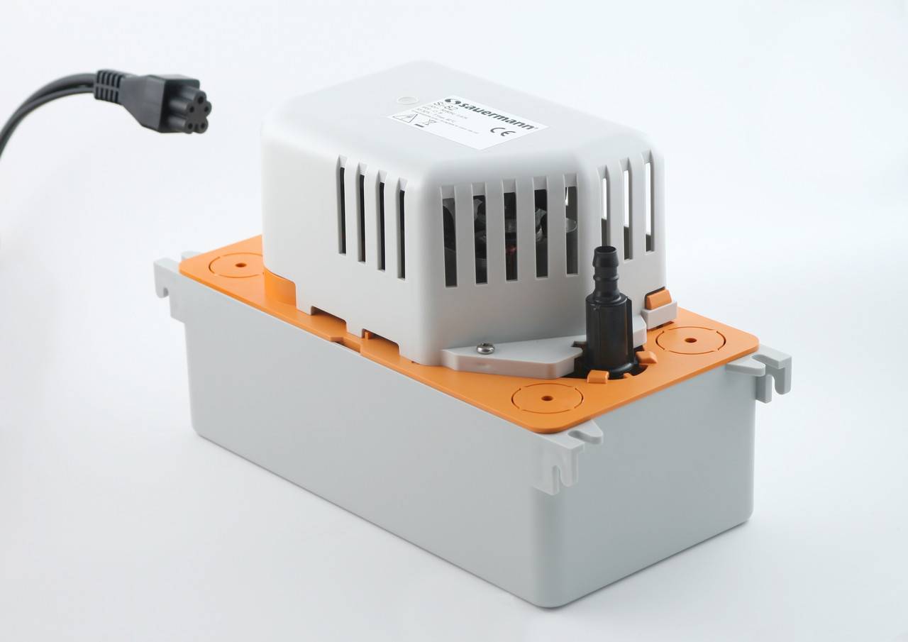 Разумеется, к такому насосу предъявляют ряд требований. Во-первых, он должен быть компактным, во-вторых, по возможности бесшумным. И, в-третьих, компрессор должен быть достаточно производительным. Ведь трасы системы удаления конденсата могут быть очень разветвленными – в некоторых случаях жидкость из поддона приходится транспортировать на несколько десятков метров, преодолевая перепады высот, обратные уклоны и вертикальные участки.