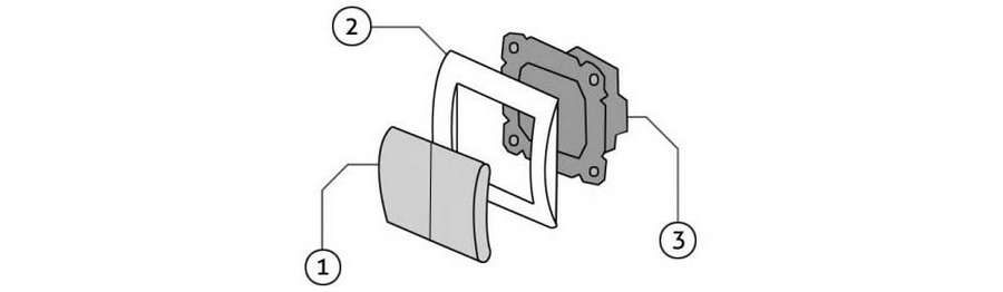 Конструкция двухклавишного выключателя достаточно проста. Он состоит из: