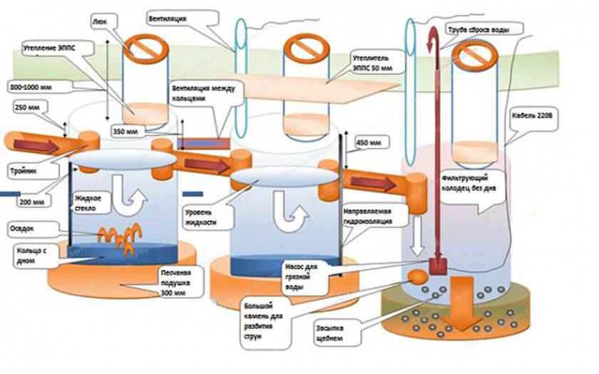 Септик с 3 камерами самый совершенный с точки зрения утилизации отходов. Два первых колодца выполняют роль отстойников разной степени очистки, к ним добавляется третий, выступающий в качестве фильтровального.