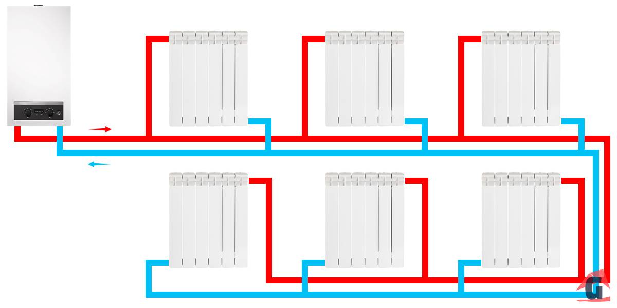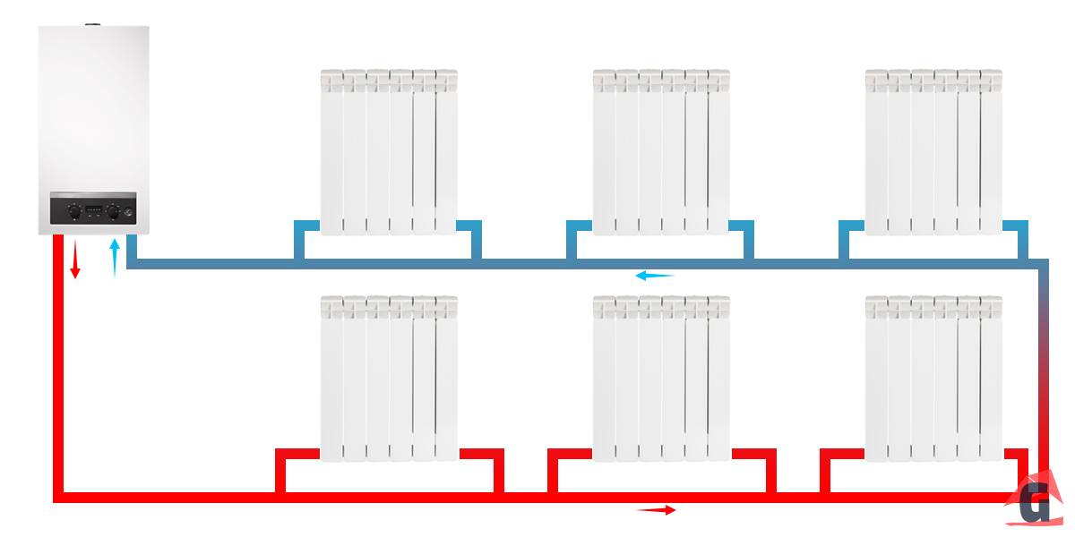 Двухтрубная разводка дает возможность равномерного прогрева батарей благодаря тому, что подающая труба параллельно подключена к каждой из них. Вторая труба отводит остывший теплоноситель обратно в котел. При условии установки крана на каждом радиаторе их можно отключать по отдельности.