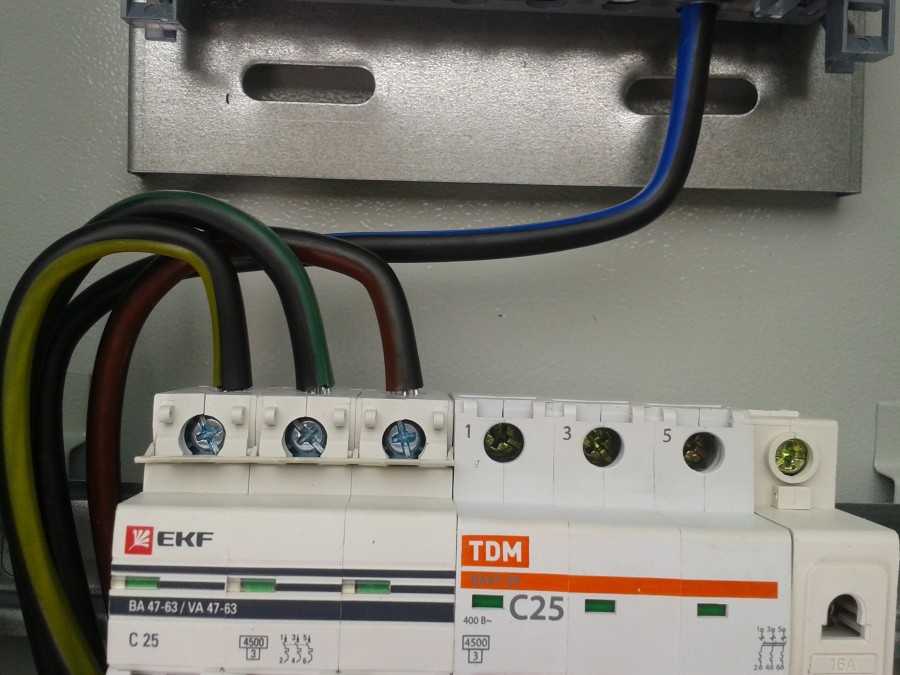 Вот наглядный пример подключения автоматических выключателей в 3-х фазном электрощите. Все фото сборки данного щитка можете посмотреть здесь: Сборка трехфазных электрощитов на заказ