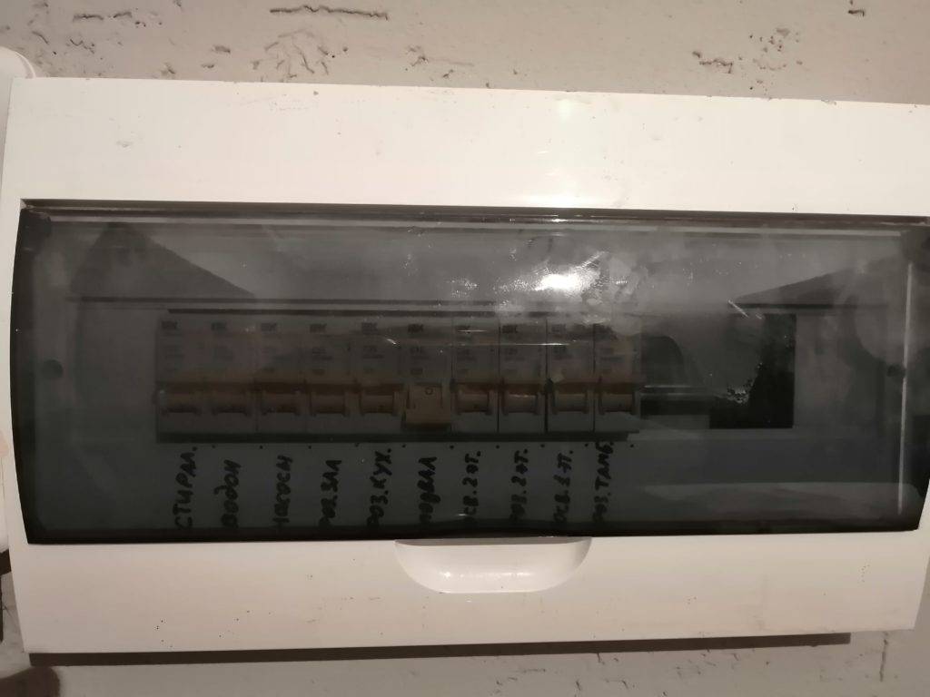 На щитке видно счетчик, а также пакетный выключатель и автоматы. Пакетный выключатель имеет вид устройства с четырьмя контактами и рукояткой поворотного типа. С магистральных электропроводов на щиток приходит фаза и ноль.