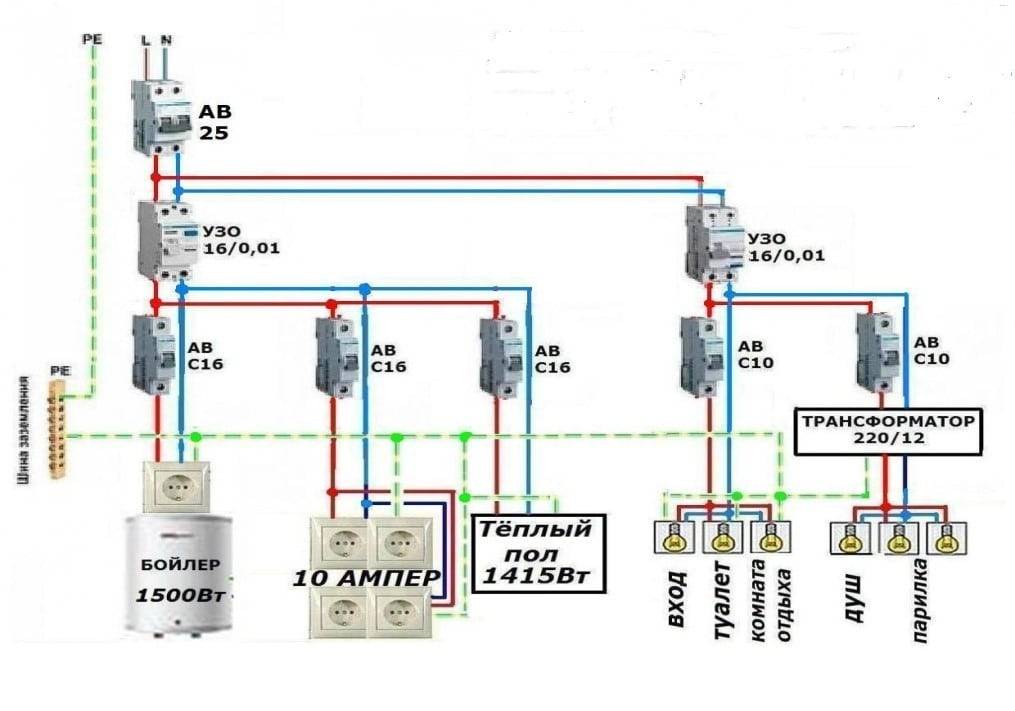 Рядом с электрическим щитком желательно повесить схему электропроводки строения. Не рекомендуется забывать о подключении УЗО: они отключают источники питания, если те по какой-то причине контактировали с водой. Это позволит спасти жизни посещающих баню людей. От возгорания обезопасит устройство защитного отключения с током отсечки. Все жилы в клеммниках должны быть прочно зафиксированы, чтобы избежать нагревания участка из-за неплотного зажима.
