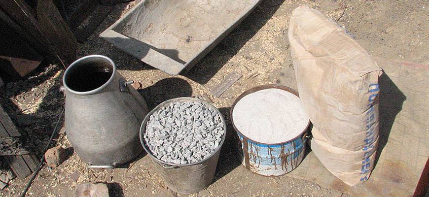 - Засыпать в большую емкость все компоненты в требуемых пропорциях. Стандарт – 1–4–2–0,5, где 1 – цемент, 4 – гранитный щебень, 2 – песок, 0,5 – вода.