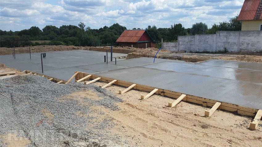Бетонирование основания лучше выполнять в теплое время года – при плюсовой температуре бетон быстрее и качественнее созревает.. Продолжать строительные работы эксперты рекомендуют не ранее, чем через 3-4 недели после бетонирования фундамента – бетон должен набрать достаточную прочность