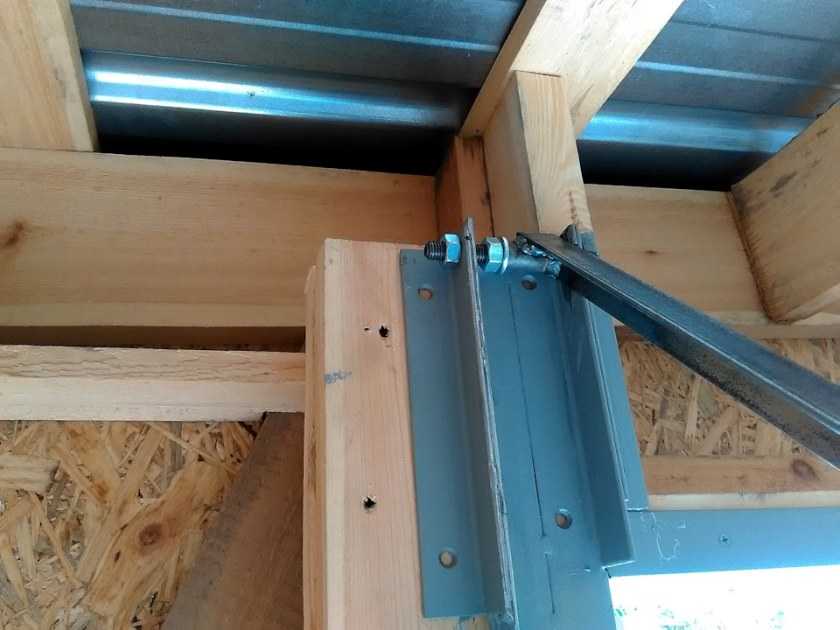 - Коробка, устанавливаемая в проёме — основной силовой элемент ворот. На неё приходится основная нагрузка всей системы гаражных ворот. Коробка делается из деревянного бруса 100*50 мм или толстого металлического уголка. Ширина полки уголка должна быть шире в 1,5 раза толщины створки, то есть, если толщина створки 40 мм то уголок берём с полками не менее 60 мм. Детали коробки устанавливаются буквой П, два по бокам проёма, один сверху. Если используем дерево то крепим саморезами 100 мм в предварительно подготовленные деревянные закладные. В случае использования уголка крепёж производим на анкерные болты, впрочем, они отлично подойдут и для первого случая.