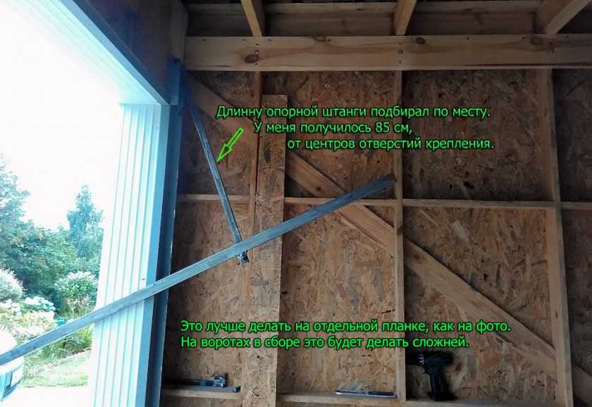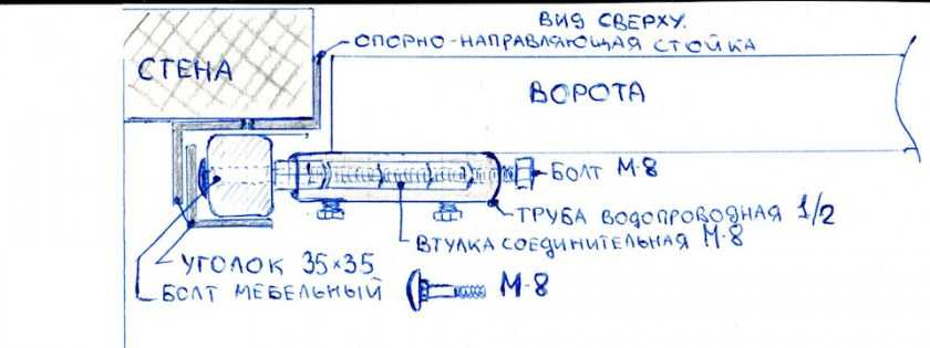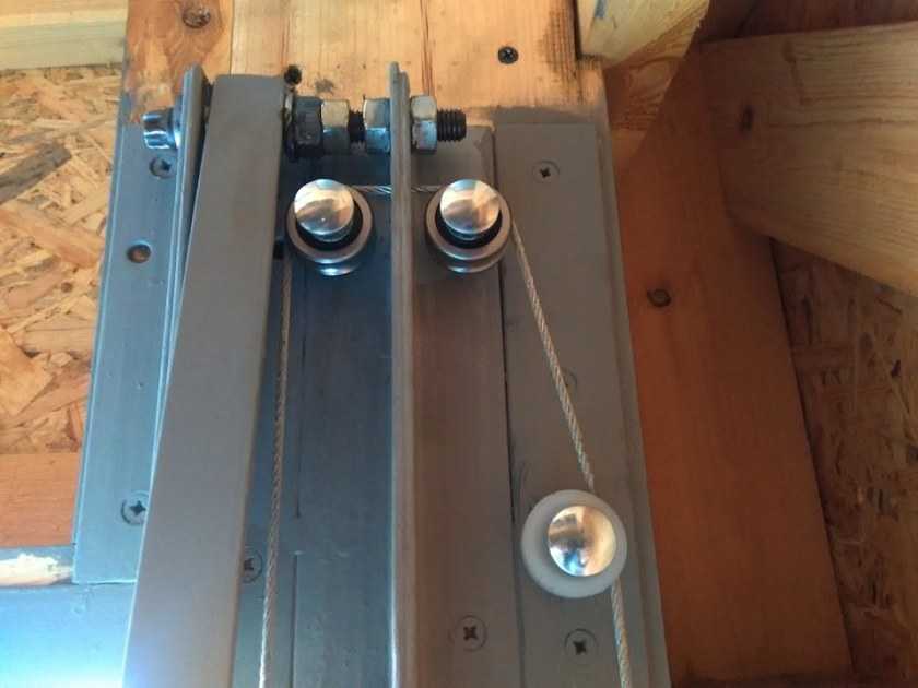 Один конец троса лебедки крепят к низу створки, потом трос пропускают через механический блок, расположенный на потолке, ближе к противоположной стене. К другому краю монтируют груз (противовес). При открытии ворот он опускается, при закрытии – наоборот. Причем масса противовеса должна быть больше, чем самой створки.