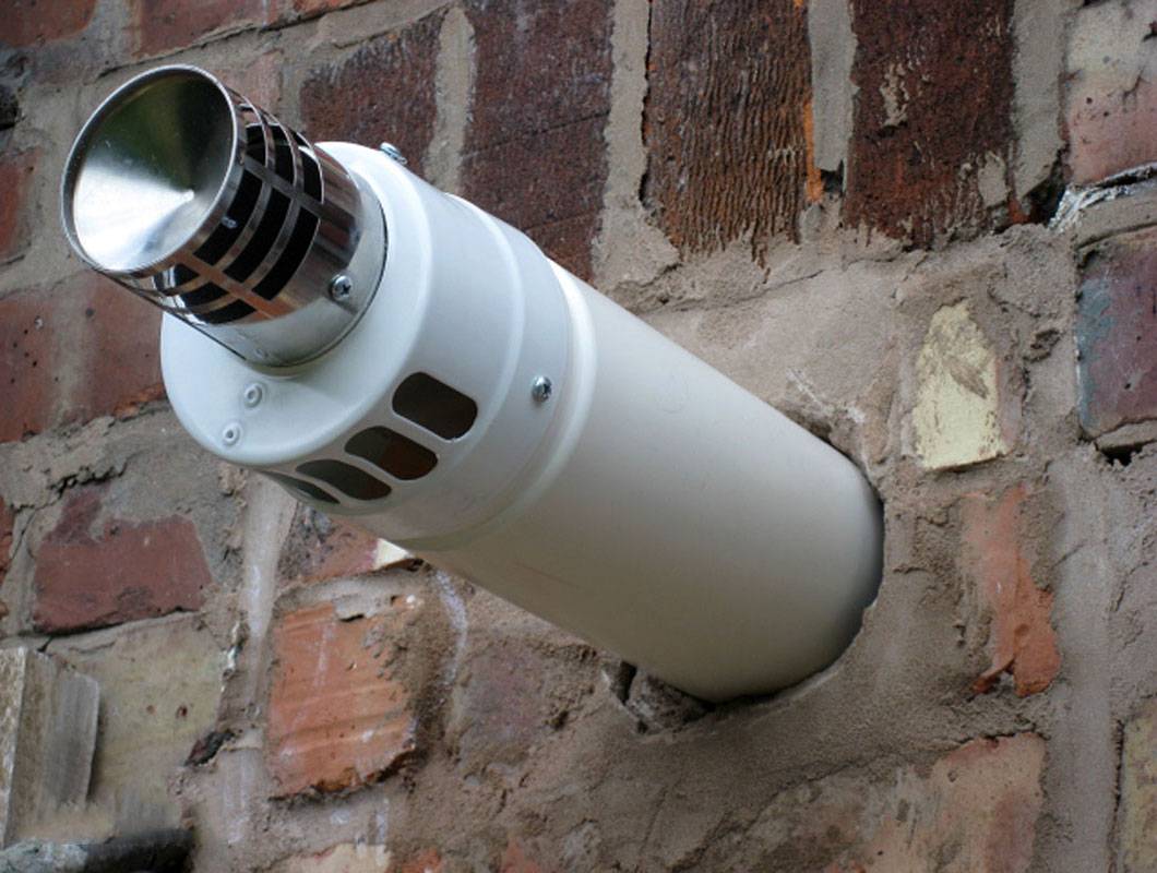 Далее следует разобраться с недостатками конвекторов. Самый главный минус такого устройства заключается в том, что для выполнения монтажа приходится пробивать стену. Причем здесь необходима дыра для коаксиального газоотвода, представляющего собой специальную трубку в трубе, по которой выходят выхлопные газы. Необходимый для сгорания свежий воздух поступает к конвектору благодаря внешней трубе. Можно предположить, что дыра в стене может находиться в определенном участке, где будет размещен сам конвектор. Если же они располагаются под каждым окном каждой комнаты, то дыр в стенах будет очень много, и их нельзя будет спрятать или вывести в один участок. Кроме того, в стене необходимо проделать дополнительное пространство для подвода газа.
