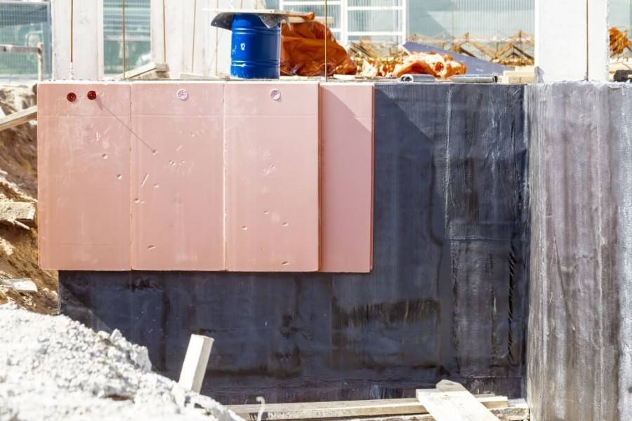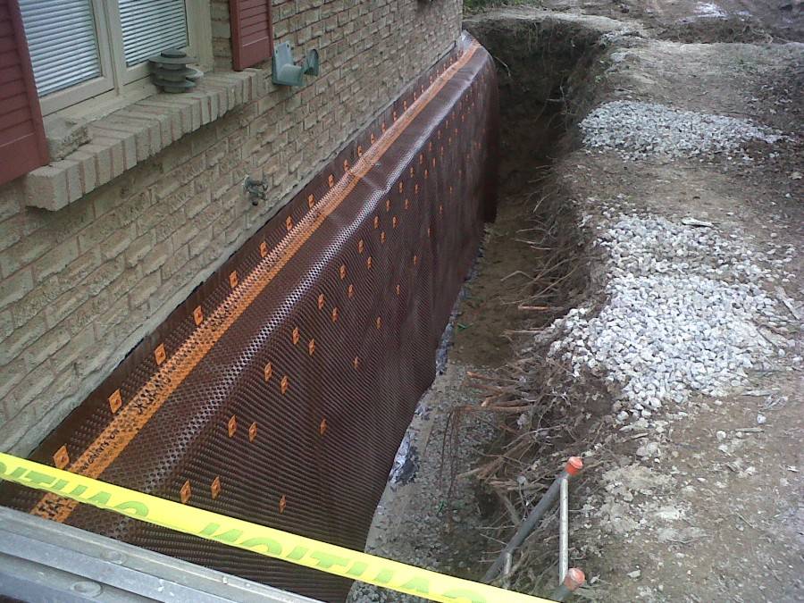 В процессе работы фундамент частично откапывают, просушивают, покрывают грунтовкой, гидроизоляцией, затем, монтирую мембрану. Задача мембранного полотна — сбор излишков воды с перенаправлением жидкости к дренажным трубам.