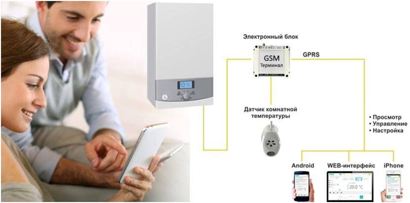 Посредником между смартфоном и газовым агрегатом является GSM-модуль. Он передает заданные режимы и в случае чего сообщает об аварийных ситуациях. Существуют модули разной степени сложности: с простейшими функциями бюджетных котлов, позволяющие работать с несколькими агрегатами.