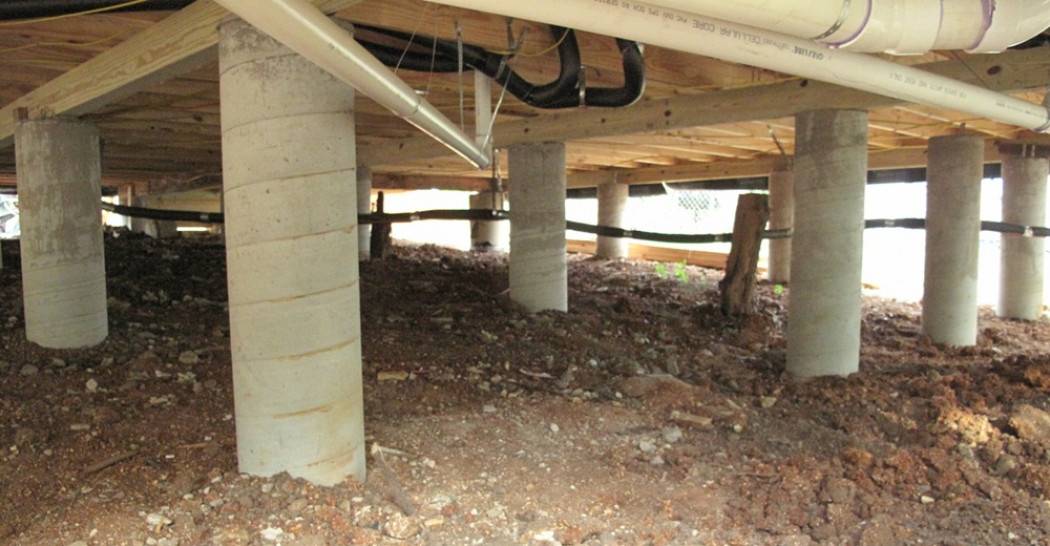 Под столбчатым основанием понимается группа свай расположенных под зданием, в первую очередь, по периметру, под углами, под капитальными стенами и пересечением перегородок. Максимальное расстояние между столбами с учетом массы здания, его размеров — 1-2 метра.