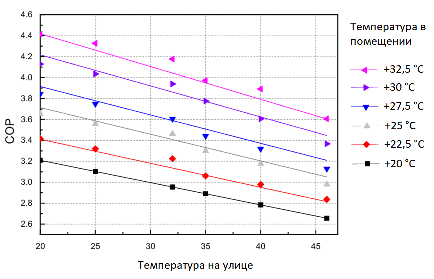 COP кондиционера в зависимости от температуры в помещении и на улице.