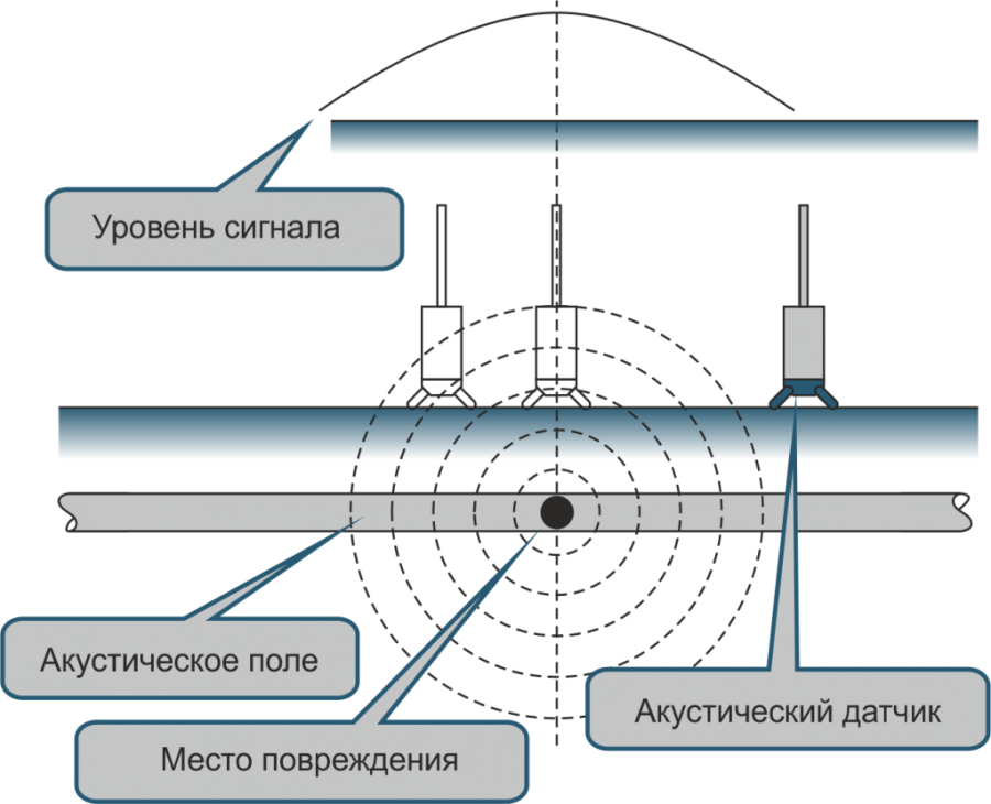 Акустический метод предусматривает использование приемника и электрогенератора мощных ударных импульсов. Конденсатор генератора присоединяют к кабелю, и когда разрядник срабатывает, напряжение в линии создаёт электромагнитную волну, происходит сильнейшее пробивание, сопровождающееся щелчком в области неисправности. Оператор улавливает щелчки при помощи акустического прибора.