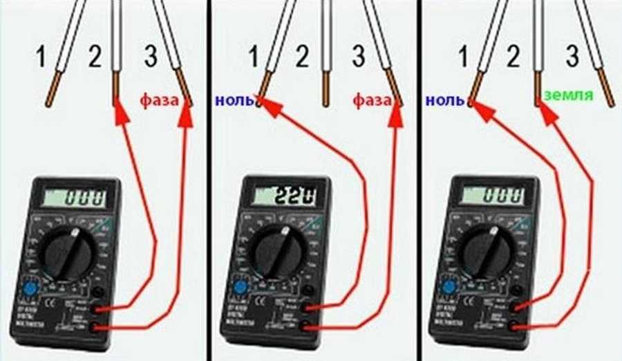 - Находят фазный провод. Для этого ставят щуп мультиметра на средний контакт любого патрона, а вторым прикасаются к двум оставшимся проводам. С помощью звукового сигнала определяют фазный провод, отмечают его или запоминают.