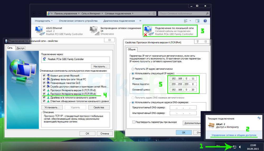 - Теперь вам нужно войти в панель управления камеры. Для этого нужно найти установленный IP-адрес камеры и установить ту же подсеть вашему компьютеру (обычно IP можно найти на наклейке на самом устройстве или в коробке девайса). К примеру, адрес 192.168.0.20. Запускаем «Центр управления сетями» меню панели управления. Там находим «Подключение по локальной сети» и одну из его вкладок — «Свойства». Настраиваем «Протокол Интернета версии 4» согласно скриншоту.