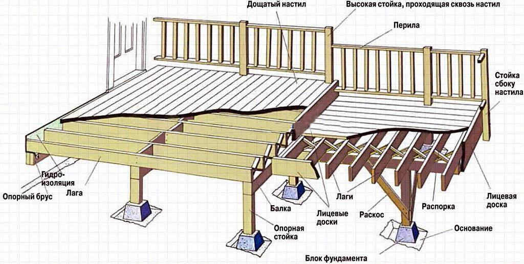 Терраса – это открытое строение, которое устанавливается на определенное основание: будь то фундаментальная конструкция, сваи, или же каркас из дерева. Она может, как примыкать к главному дому или возводиться отдельно; оформляться доп. деталями (навесами, ограждениями).