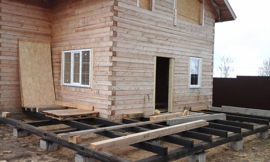 2. При пристройке террасы к деревянному дому передняя стенка выполняется из 6 столбов подходящей длины.
