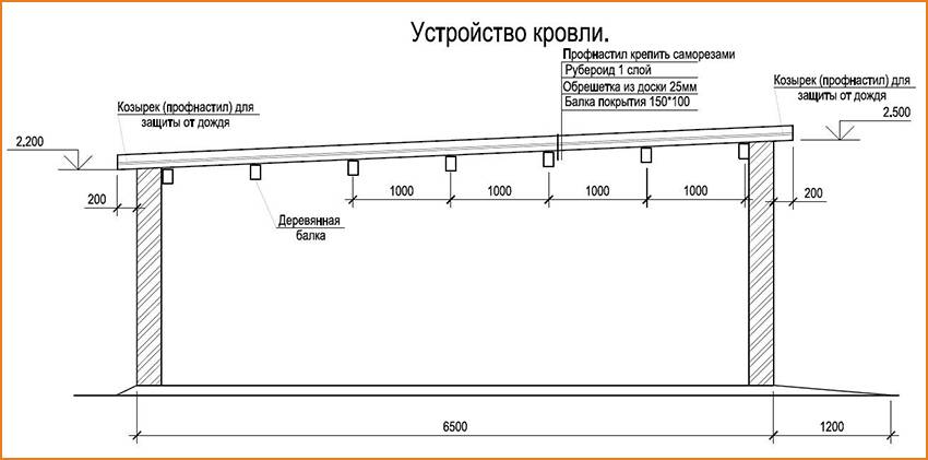 - Кровельные работы производятся в виде стропильных пар, которые совпадают с количеством стоек. Для усиления прочности используют железные откосы. Черновое перекрытие покрывается профнастилом внахлёст.