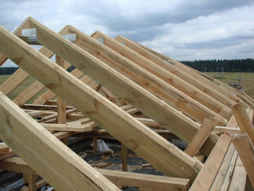 - Стропильные ноги — длинные доски, которые под углом крепятся между собой, придавая треугольную форму крыше. Сечение досок 100×150 или 50Х150. Конструкцию из двух стропильных ног называют фермой. В зависимости от здания и вида кровельного покрытия делают определенное количество ферм. Максимальное расстояние между ними равняется 120 см, минимальное — 60 см. Рассчитывая шаги стропильных ног, учитывают: вес покрытия, ветровую нагрузку и количество снега в зимнее время.