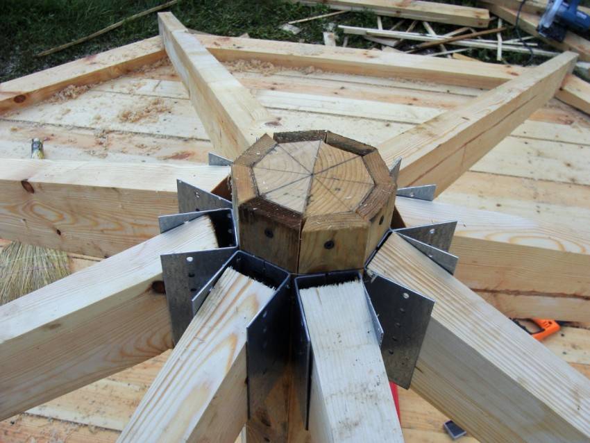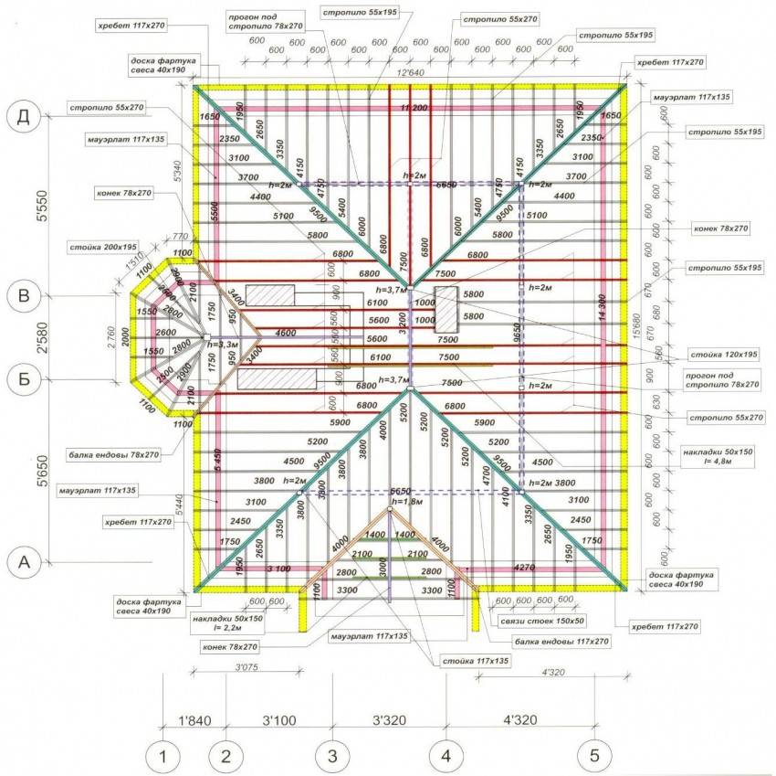 Эта крыша вальмовая, но скатов намного больше, чем четыре. Но принцип, по которому собирается стропильная система — такой же, как у простой четырехскатной