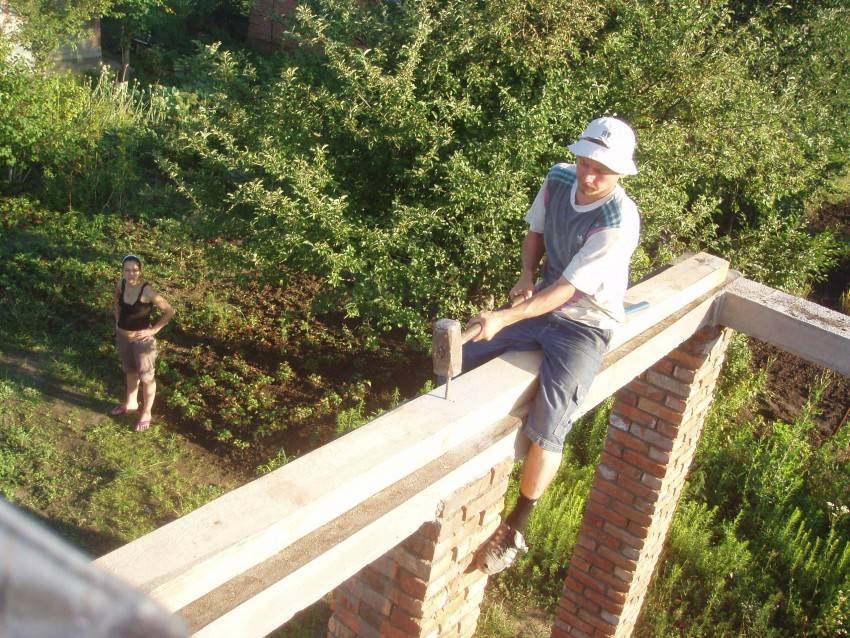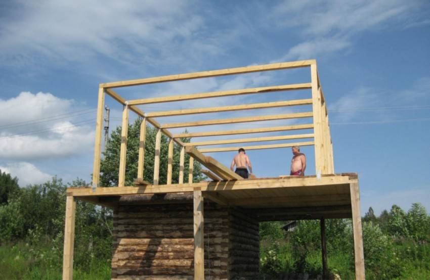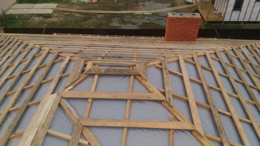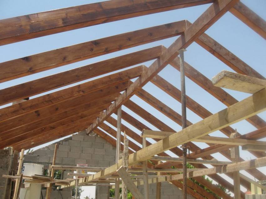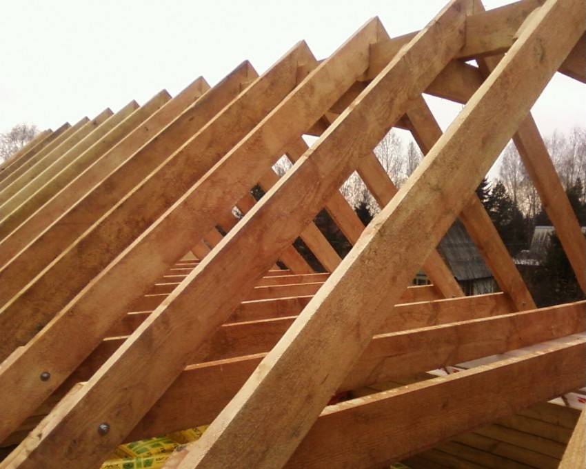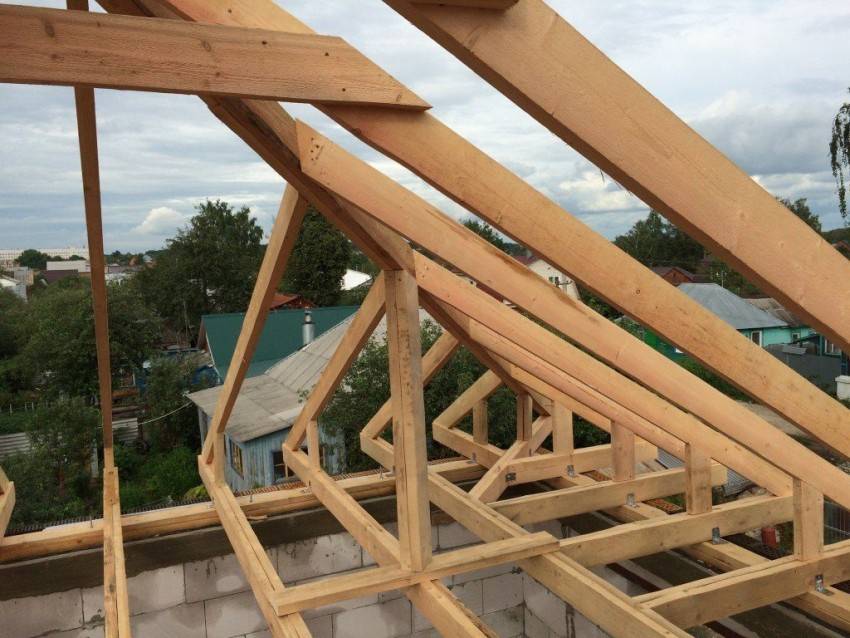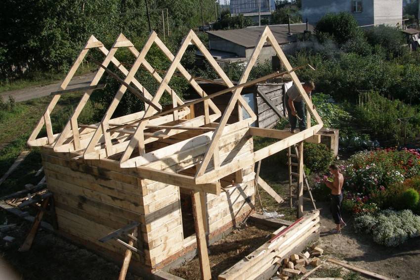 На перекрытии дома раскладываются доски 50×150 мм, изготавливается треугольник необходимой высоты из двух стропильных ног и доски-стойки (ее длина соответствует высоте будущей крыши), соединенных гвоздем. Вдвоем или втроем конструкция поднимается — стойка устанавливается на центральной оси перекрытия, стропила устанавливаются на мауэрлат.